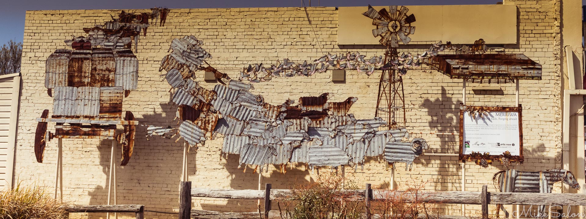 The Tourist Welcoming Centre has its own highlights. In the forecourt, there was the most stunning mural we have seen, more of a sculpture really, because it was made of recycled materials mounted proud of the wall behind it. The mural `Looking Back, Forging Ahead` was of corroded corrugated iron recovered from nearby sheds. The artists were Murrurundi sculptors Fran Wachtel and Charlotte Drake Brockman. The artwork features a dray of wool pulled by bullocks, a mob of sheep lead by a ram herded by kelpies, a flight of galahs, a windmill, a horse and a shed. We have never seen Australiana so beautiful. And we just stumbled upon it on a one day visit to town!